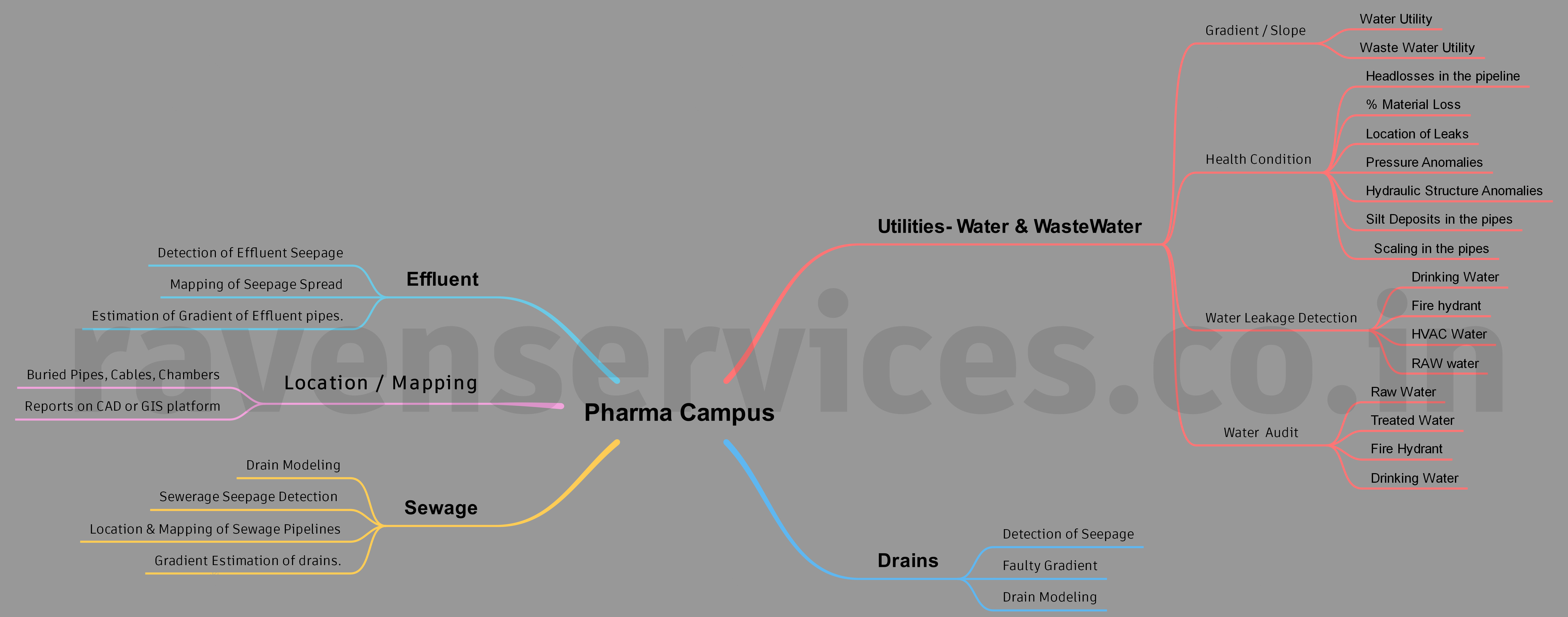 Pharmaceuticals Campuses are full of different kinds of drains and pipes. Also, working with various chemicals, such clients are very much concerned on environmental cause. We do provide services to detect the spread of effluent or chemicals in the sub surface though buried drains or pipes. Kindly go through below charts to get the details.