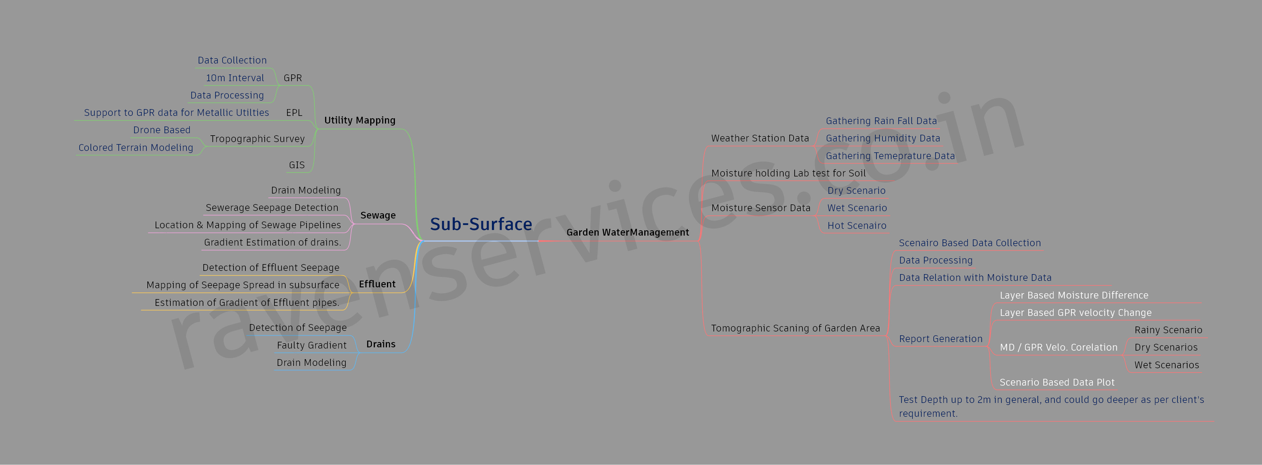 For your buried utility's location and mapping the lost pipes, for investigations on client's issues with ground and sub surface works, etc., we provide multiple services with, Ground Penetrating RADAR, Electro-Magnetic Tomography and Electrical Resistance Measurements.